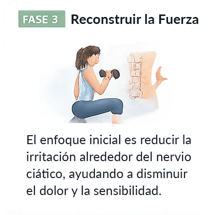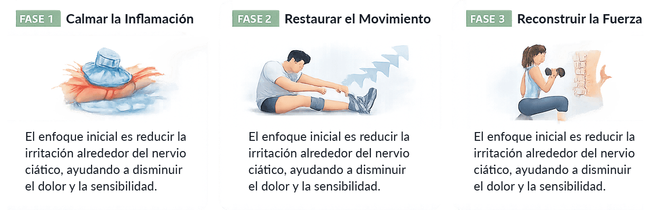 En lugar de intentar forzar el movimiento demasiado pronto, el sistema guía al cuerpo paso a paso a través de tres fases específicas que ayudan a reducir la irritación del nervio y restaurar la función normal.