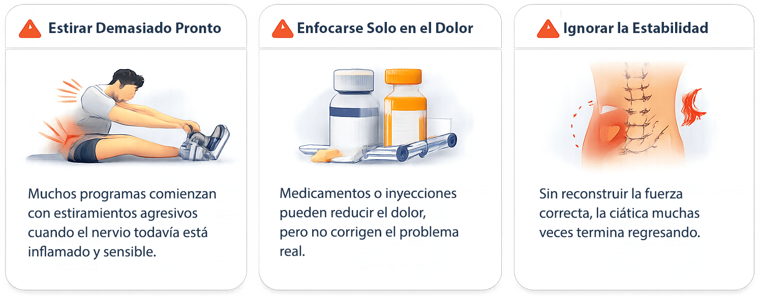 El problema es que muchos tratamientos intentan forzar el movimiento demasiado pronto, cuando el nervio todavía está inflamado y sensible.